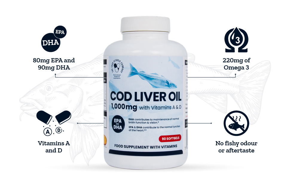 UK's Best quality fish oil | 1000mg pure Cod Liver Oil (Fish) | 80mg EPA and 90mg DHA | Omega 3 220mg fortified with generous amounts of Vitamins A and D | No fishy odour or aftertaste unlike other brands | Easy to swallow softgels | 1 softgel per day - 3 month's supply | New, eco-friendly, biodegradable packaging | Made In UK | Best quality - manufactured in certified GMP facility.